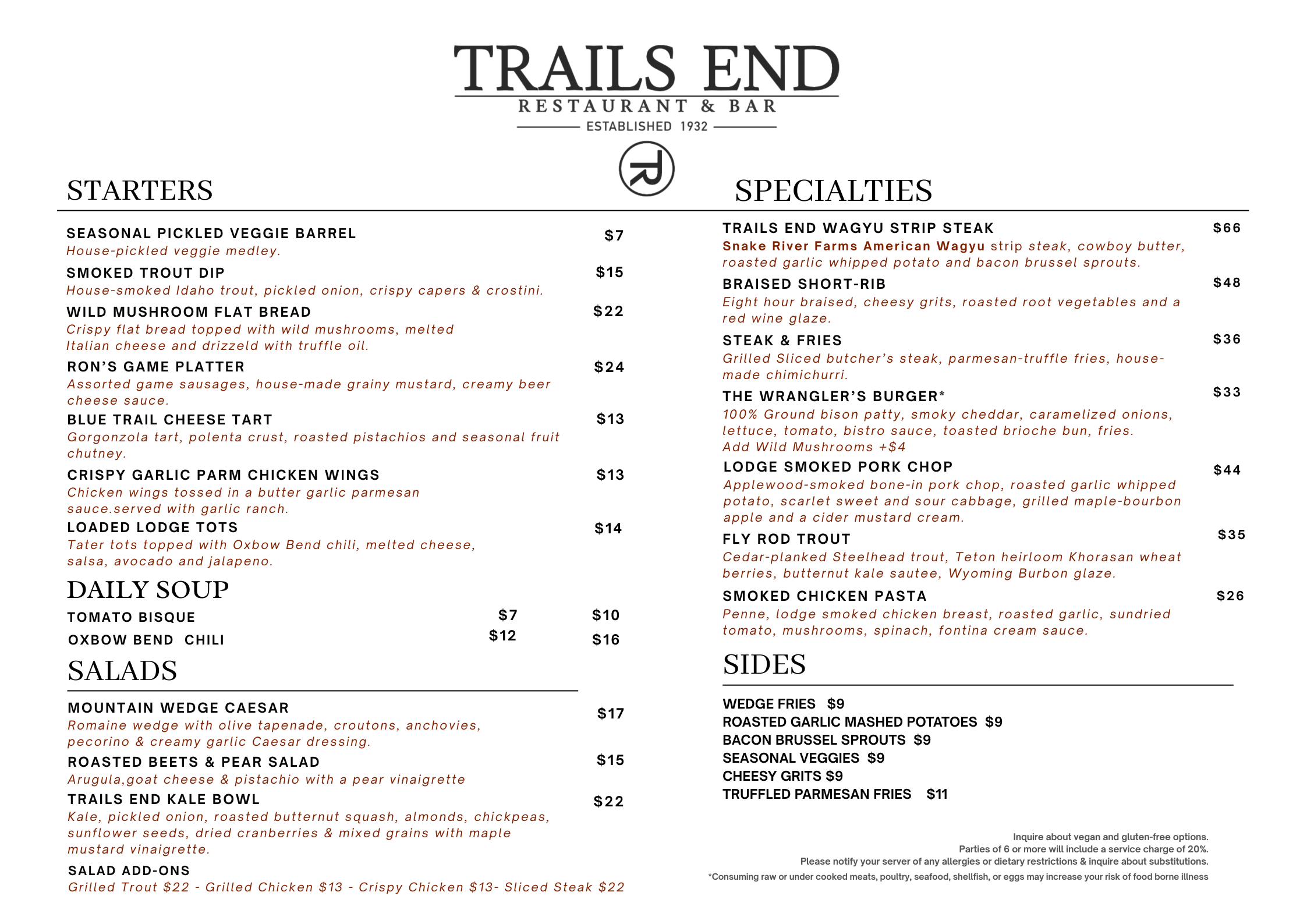Dinner at Trails End 5:00 pm - 8:00 pmReservations Required(307) 543-2000 RESERVATIONS Kids Menu DRINKS